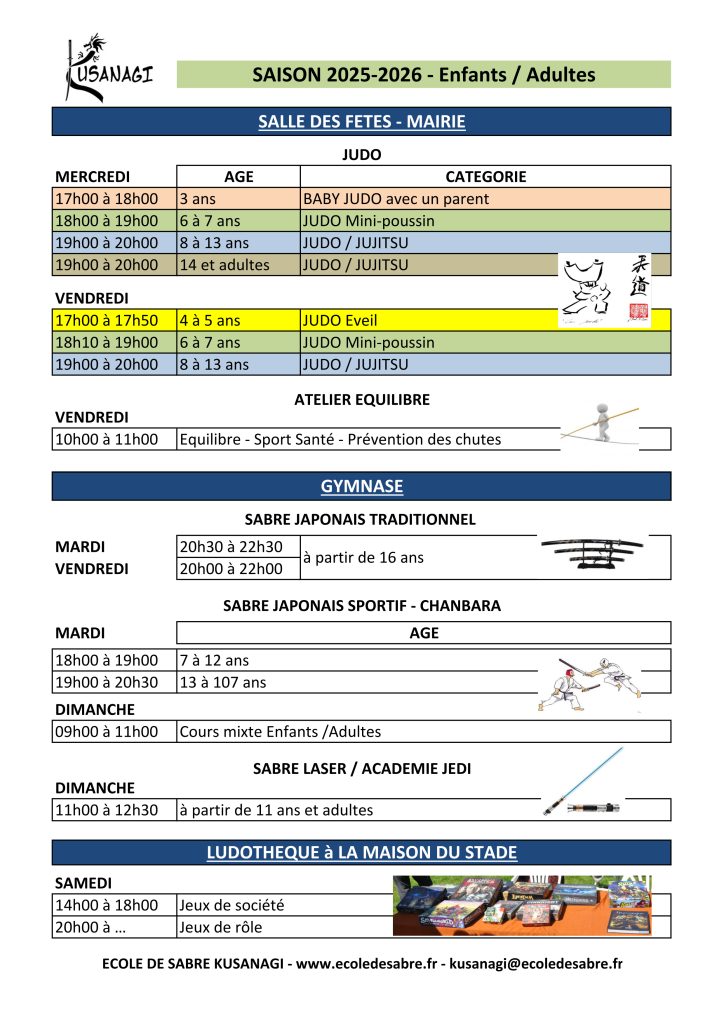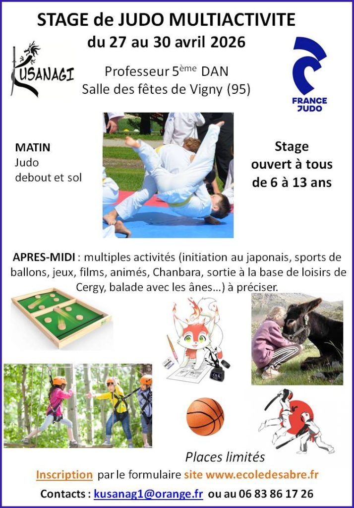 Accueil Stage de Judo fin avril Pour plus de précision sur le Stage de Judo ou pour s’inscrire, cliquez ici. Pour plus d’informations, n’hésitez pas à nous contacter. Ouverture d’une section Ludothèque, tous les samedis au stade de Vigny, dans la salle à côté des terrains de tennis. à partir de 14h pour les jeux de société à 20h pour les jeux de rôle L’école de sabre Kusanagi au JT de VOnews :